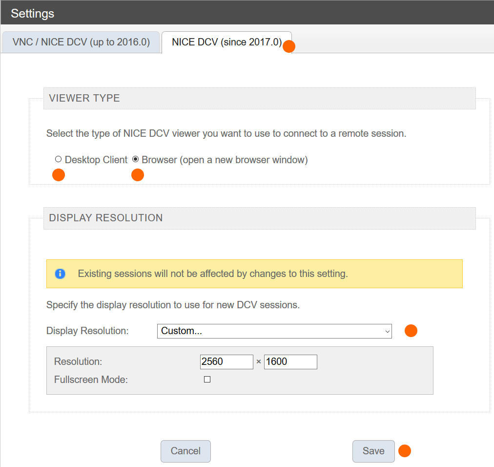 Got to the NICE DCV (since 2017.0) Tab. Select the Viewer type. For windows and Linux users we suggest that you use the desktop client that can be downloaded from the NICE software repository or from AWS NICE Software. Mac users should use the browser client (with HTML5 support). The browser client works fine for the other systems as well.