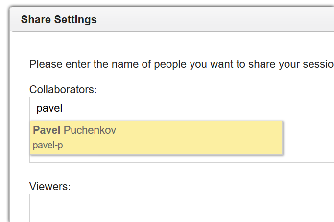 To Share this session with any of your collaborators (who also must have the access to DCV restricted resource) click Not Shared. In the window that appears, start typing the persons name in Collaborators (to provide controls to your session) or in Viewers (just for observing your session):